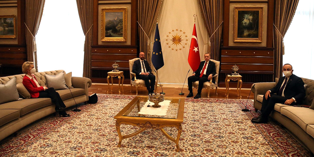La vicenda che coinvolge Charles Michel (Consiglio Europeo) e Ursula von der Leyen (Commissione Europea) ha tratti piuttosto umoristici nella rappresentazione fattane dai media italiani, che hanno tentato di popolarizzare – riuscendoci, in buona parte – una sorta di farsa degna dei pettegolezzi delle riviste da parrucchiere: la sedia, il divanetto, il Turco cattivo e il maltrattamento (?) subito dai “nostri”, anzi dalla “nostra” von der Leyen, che naturalmente in quanto donna è disprezzata dal Turco cattivo. Non manca nemmeno il malumore fra i due Europei, protagonisti dell’incontro, che per tre giorni – ci assicurano – non si parlano.